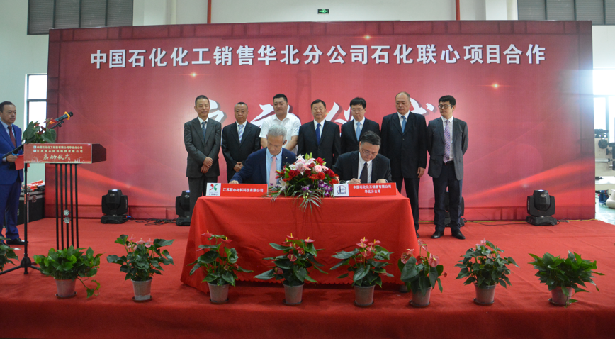 中国石化化销华北分公司副总经理荣刚、江苏联心董事长黄津渠共同签订石化联心项目合作协议。